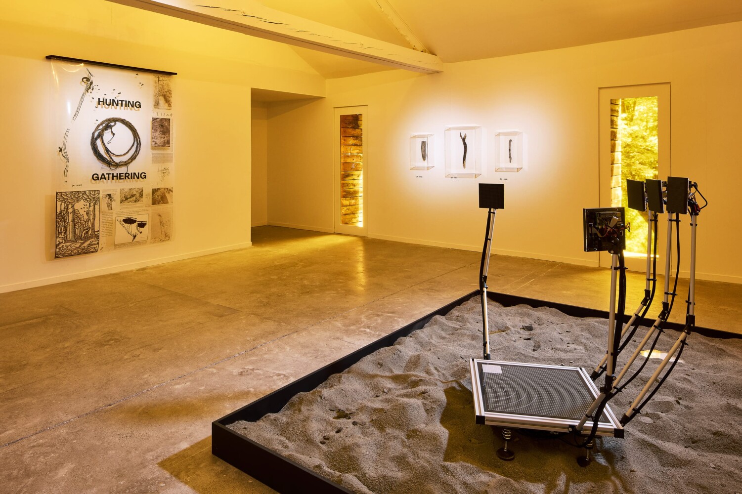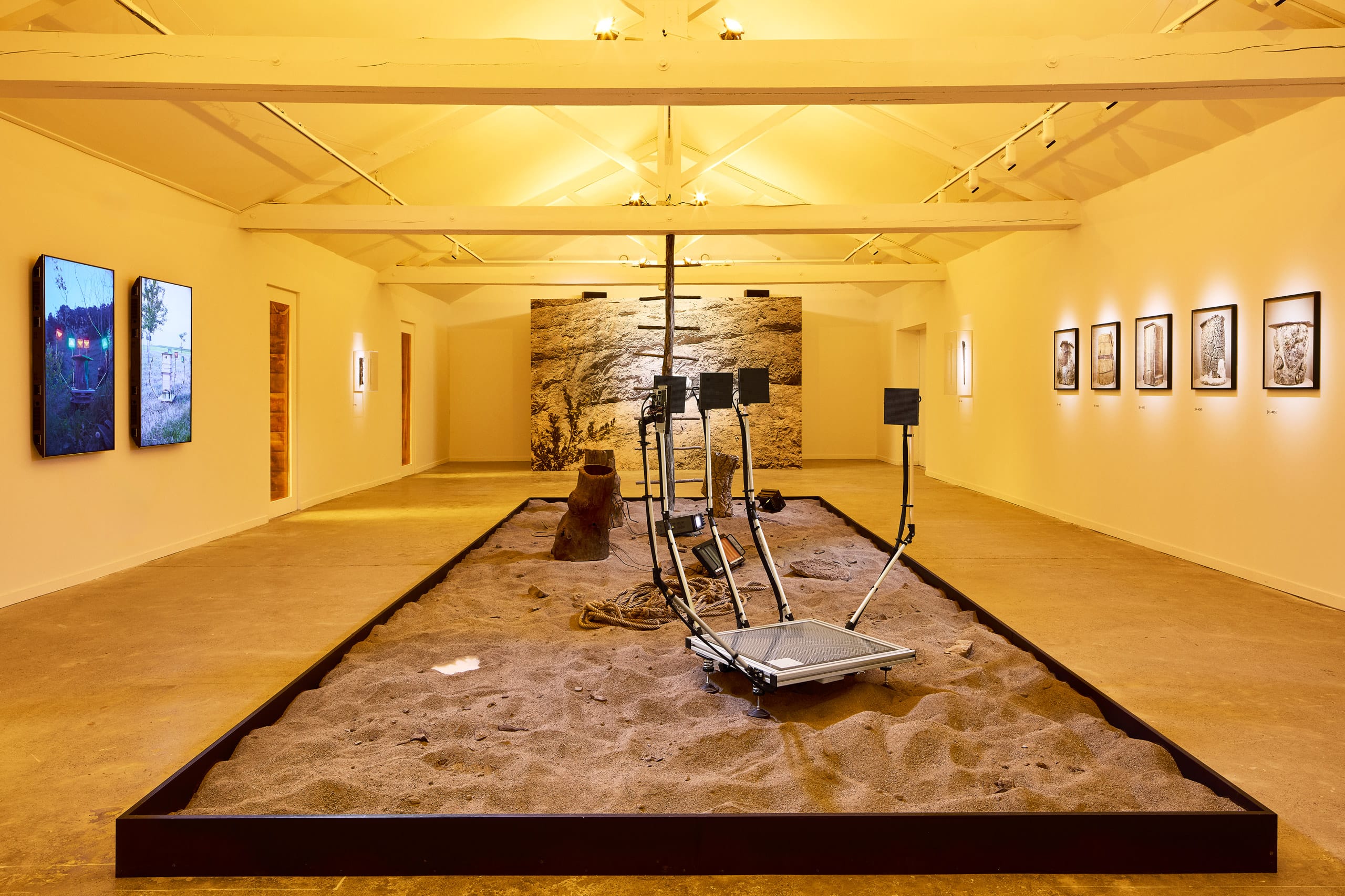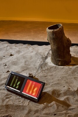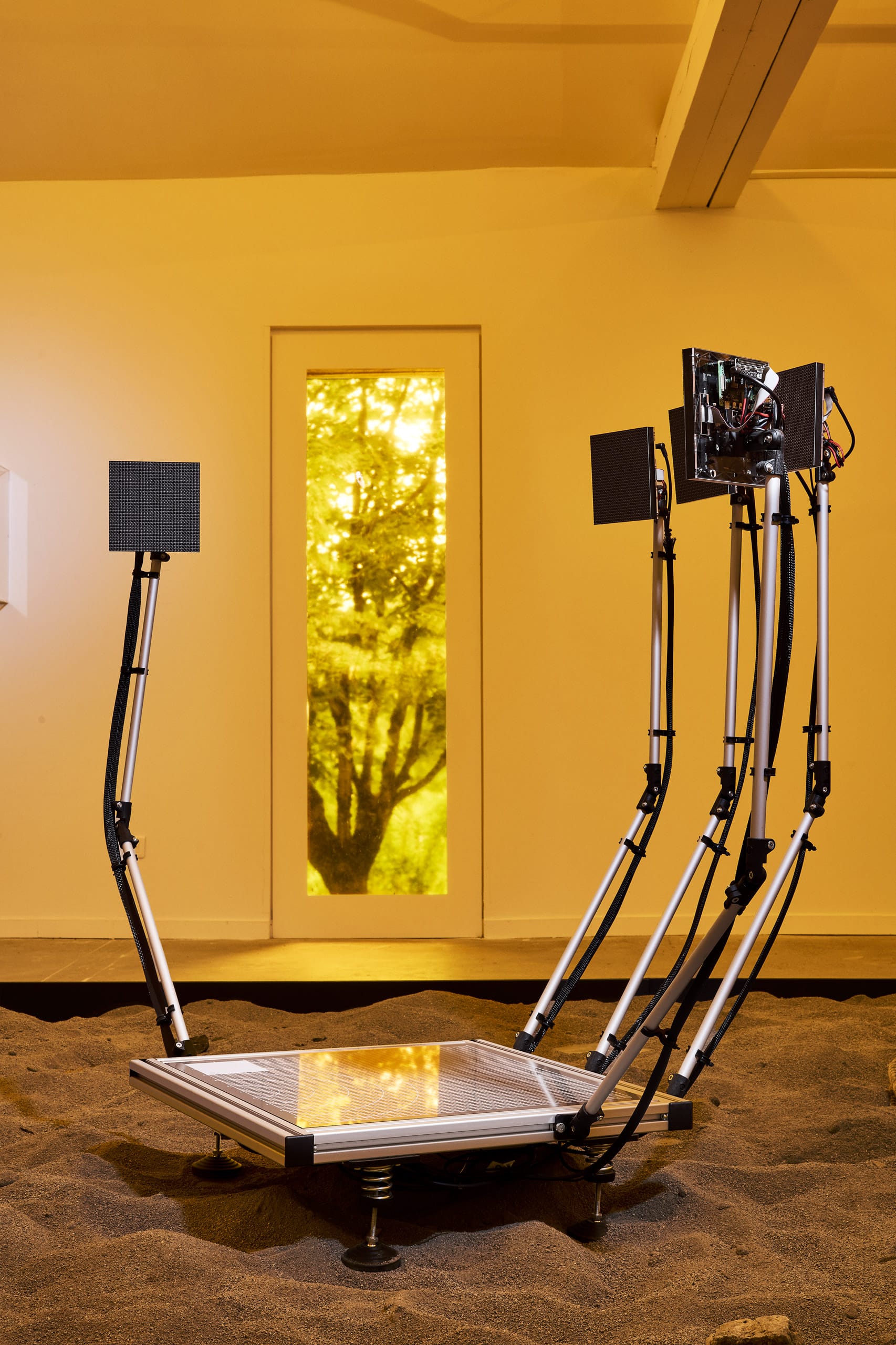 Fragmentin et Apian ont conçu un dispositif sculptural et performatif mettant en lumière la brutalité et l’absurdité de l’utilisation de ces technologies dans notre système capitaliste actuel. La sculpture, rappelant une main mécanique, semble se refermer sur la ruche positionnée en son centre. Certains détails du dispositif font référence à des éléments de captation tels une balance – un des capteurs les plus utilisés en apiculture digitale – ou encore une grille de mesure. À la cime de chaque phalange se trouve un écran LED, rappelant les écrans de la Bourse. La sélection des matériaux contraste avec le contexte naturel dans lequel les performances ont été filmées, soulignant l’absurdité du contexte actuel, tout en proposant une nouvelle esthétique hybride entre nature et technologie laissant présager une autre utilisation possible de ces technologies.