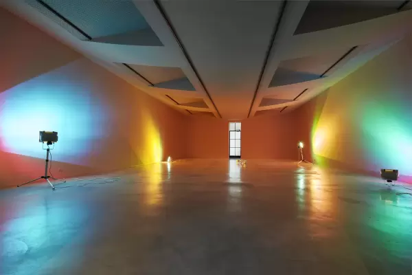 À travers une série d’œuvres, la lumière s’éprouve sous différents états : diffusée, réfléchie, absorbée, capturée, projetée et transformée. Dans l’espace d’exposition principale, des projections de lumières dichroïques colorées submergent le spectateur placé dans une situation où le corps et l’esprit naviguent en permanence entre contemplation et immersion. L’expérience sensorielle se prolonge entre la dissolution et la résolution indéfiniment réinventées au rez-de-jardin où l’installation de deux aquariums donne l’illusion de la matérialité.